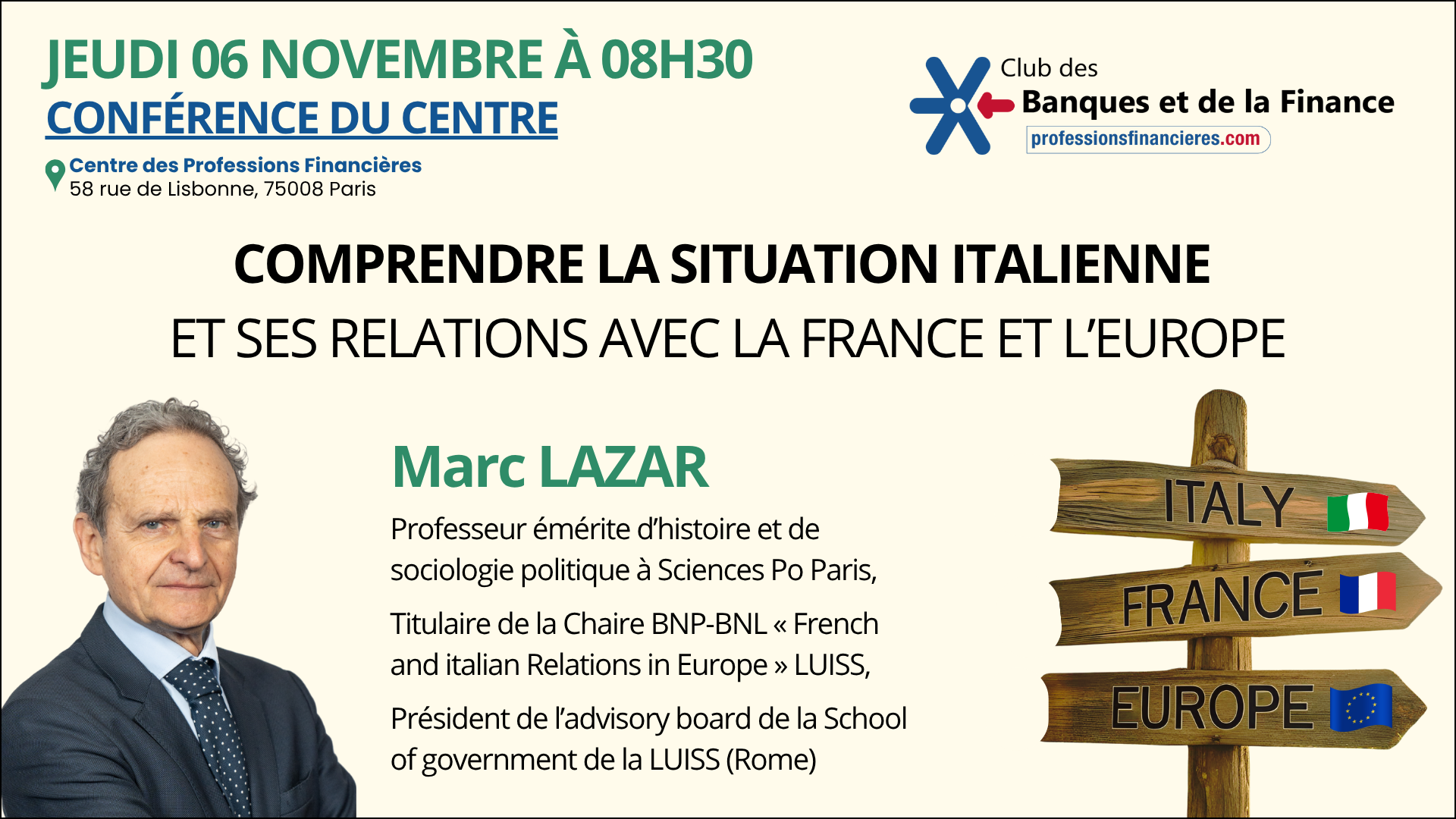 Le Centre des Professions Financières et son Club des Banques et de la Finance sont heureux de vous convier à leur rencontre qui se tiendra le jeudi 06 novembre 2025 à 08h30 au Centre des Professions Financières, avec l'intervention exceptionnelle de Marc LAZAR, professeur émérite d’histoire et de sociologie politique à Sciences Po (Paris), titulaire de la Chaire BNP-BNL « French and italian Relations in Europe » à la LUISS, Président de l’advisory board de la School of government de la LUISS (Rome), sur le thème :