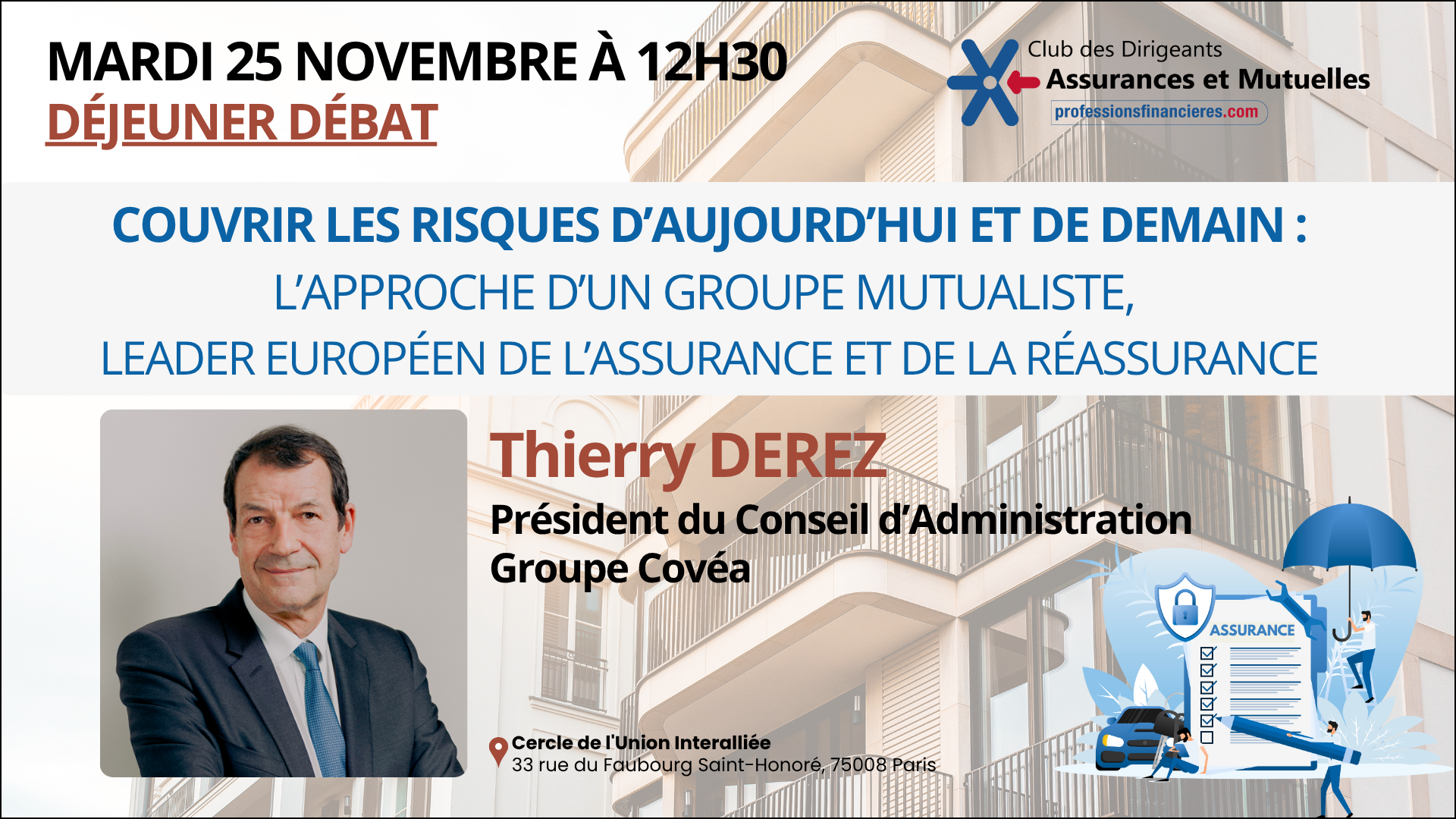 Le Centre des Professions Financières et son Club des Dirigeants Assurances et Mutuelles sont heureux de vous convier à leur grand déjeuner-débat qui se tiendra le mardi 25 novembre 2025 de 12h30 à 14h avec l’intervention exceptionnelle de Thierry DEREZ, Président du Conseil d'Administration du Groupe Covéa, sur le thème :