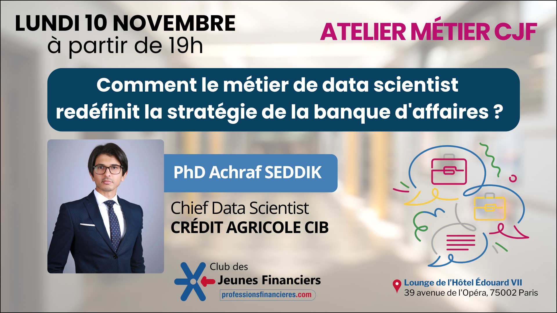 Le Club des Jeunes Financiers, avec le soutien du Centre des Professions Financières, vous convie le lundi 10 novembre 2025 à 19h à un atelier métier avec Achraf SEDDIK (PhD), Chief Data Scientist Crédit Agricole CIB :