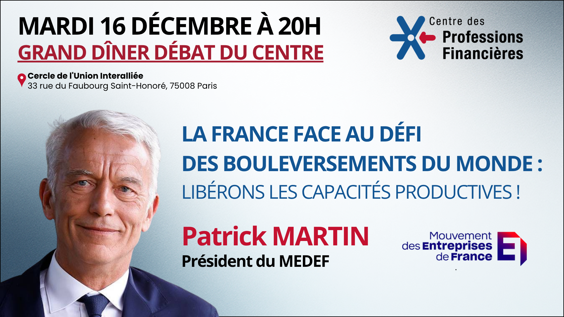Le Centre des Professions Financières est heureux de vous convier à son grand dîner débat qui se tiendra le mardi 16 décembre 2025 de 20h à 22h30 (accueil à partir de 19h30) avec l’intervention exceptionnelle de Patrick MARTIN, Président du Mouvement des Entreprises de France - MEDEF, sur le thème :
