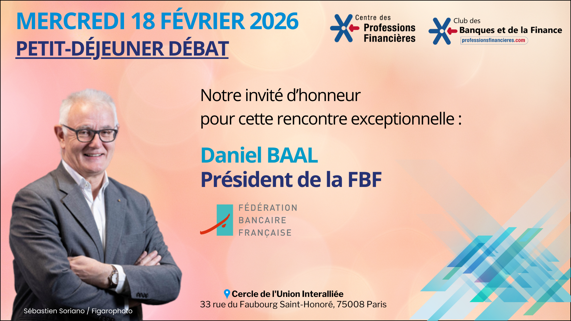 Le Centre des Professions Financières et son Club des Banques et de la Finance sont heureux de vous convier à leur petit-déjeuner débat qui se tiendra le mercredi 18 février 2026 à 08h30.